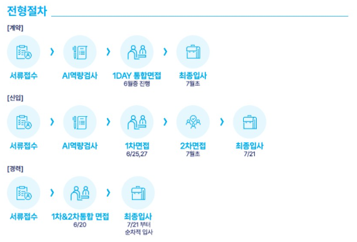 신입 전형의 경우 기본 서류 전형을 시작해 AI 역량 검사, 1차 면접, 2차 면접에 이르는 절차를 통해 지원자의 역량을 다각도로 검증하고 있죠.