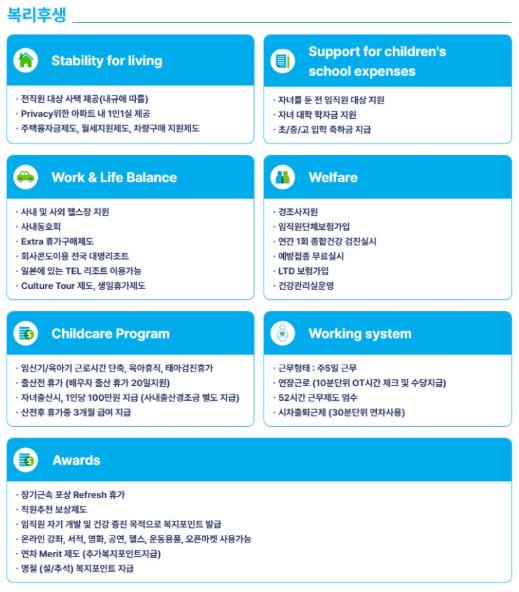 또한 임신기·육아기 근로시간 단축 및 육아휴직, 태아검진휴가 등 가족 친화적인 제도까지 폭넓게 운영하며 일과 삶의 균형을 지원하고 있는데요.